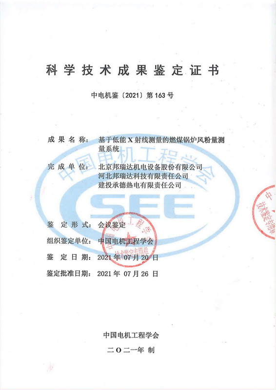 2021年7月20日,中國(guó)電機(jī)工程學(xué)會(huì)在北京組織召開(kāi)了“基于低能X射線(xiàn)測(cè)量的燃煤鍋爐風(fēng)粉量測(cè)量系統(tǒng)”項(xiàng)目技術(shù)鑒定會(huì)。